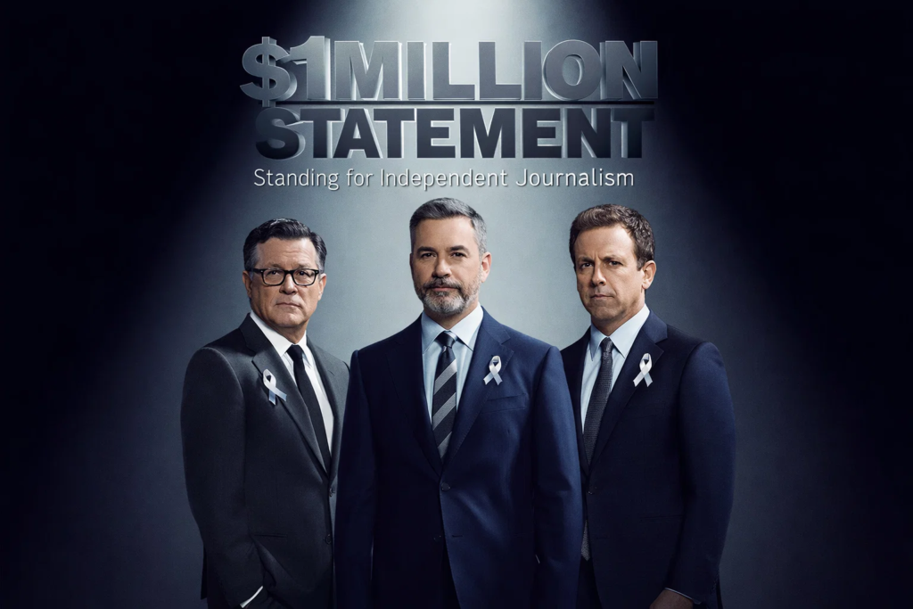 There were no monologues, no studio laughter, and no on-air declarations, only a coordinated pledge that appeared the same day across multiple late-night teams.According to people familiar with the matter, Jimmy KimmelStephen Colbert, and Seth Meyers committed one million dollars toward independent journalism initiatives.